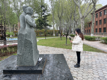 与榜样同行,刻苦钻研治学。百廿山大,文史见长。前辈学者的专心治学、刻苦钻研奠定了山大的学术传统与辉煌成就。怀着崇高的心情致以深切的缅怀,姚海凤不禁回忆起冯沅君和陆侃如先生的生平,与其他党员分享先生们在喧闹中寻找静谧,在恬静淡泊中相伴相守,在艰难中还坚持着自己的研究和著作的故事。先生们参加教育救国的事迹及在古典文学研究领域的重要贡献也令杨婧琪无比敬仰,她表示要立志做有理想、敢担当、能吃苦、肯奋斗的新时代好青年。宋文婷站在蒋维菘雕像前,重温了先生以学养艺、以艺显学,刻苦钻研书法篆刻艺术的故事,感佩于先生博古通今的思想深度、内涵深邃的书法气派。先生们潜心钻研的精神令詹绪婷十分动容,她决心要以之为榜样,用功读书,做好学问,为学科研究贡献自己的一份心力。