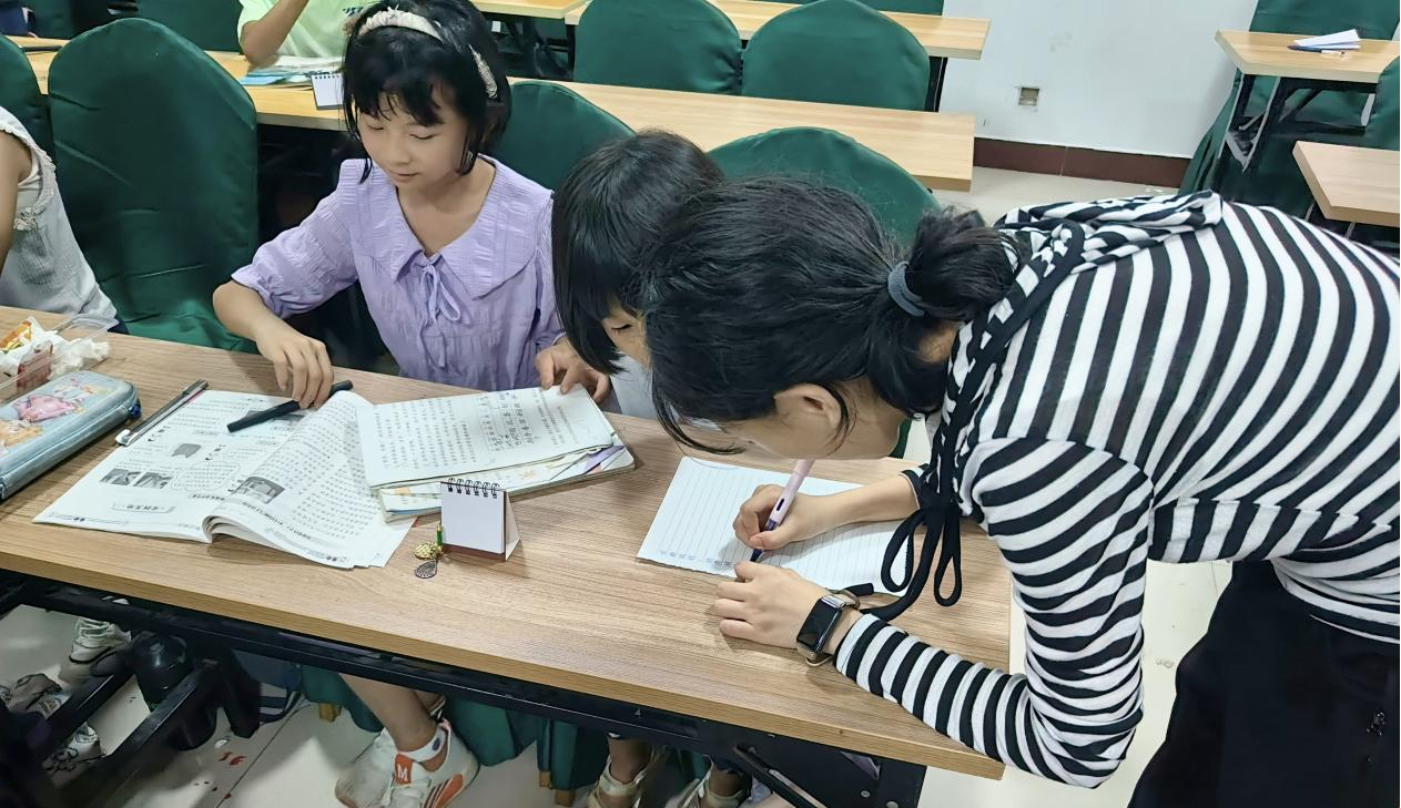 次日,支教团队针对湖头镇17名乡村孩童开展“点对点”课业辅导,提升孩子们的学习能力与信心。同时团队开展“艺术启蒙课堂”,通过击鼓传花、诗词背诵、盲盒礼物、剪纸创意制作等形式,填补当地乡村儿童艺术教育资源的空白。孩子们从一开始的羞涩到主动展示才艺,艺术感知力与表达力显著提升,丰富了乡村孩童的暑期文化生活。