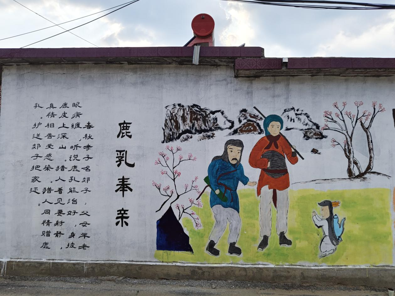 7月15日起,支教队正式开展刘家哨村墙绘项目,助力乡村精神文明建设。队员们借鉴24孝经典故事,将“百里负米”“鹿乳奉亲”等绘于墙面,让孝文化融入村民日常;同时绘制社会主义核心价值观标语,搭配牵牛花、向日葵等乡土元素,使文明理念与乡村生活深度融合。期间支教队成员克服无专业基础、高温等困难,稳步推进墙绘;刘书记等干部主动提供绘画工具、饮用水等物资。最终,总面积约80平米的斑驳墙面完成改造,蜕变为“会说话的文化阵地”。这不仅改善了村容村貌,成为湖头镇乡村风貌新名片,还推动传统文化与现代文明在乡村落地生根。