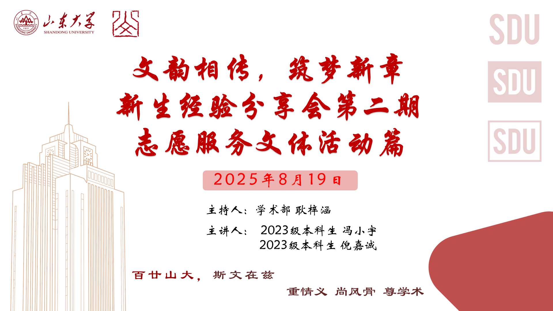 在学业篇中, 强基班2022级本科生李文清立足于山大文院的广度与深度,鼓励新生用勇气去探索旷野、以专注来铺设轨道,自由而踏实地探索崭新的老员工活。拔尖2.0班2023级本科生郭怡珂结合个人对文学的理解和认知,期望新生永远怀揣文学热情与少年心气,跟随前辈脚步,不断追寻更好的自己。中文班2023级本科生张嘉煜聚焦更加细化的学习方法,同新生深入探讨课程选择、绩点焦虑等问题,勉励新生在试错中不断成长。基地班2024级本科生陈容舟分享了课程学习及选拔考试的相关经验,并给予了合理备考的建议与策略,以期帮助新生们更好应对新学期的学业考验。