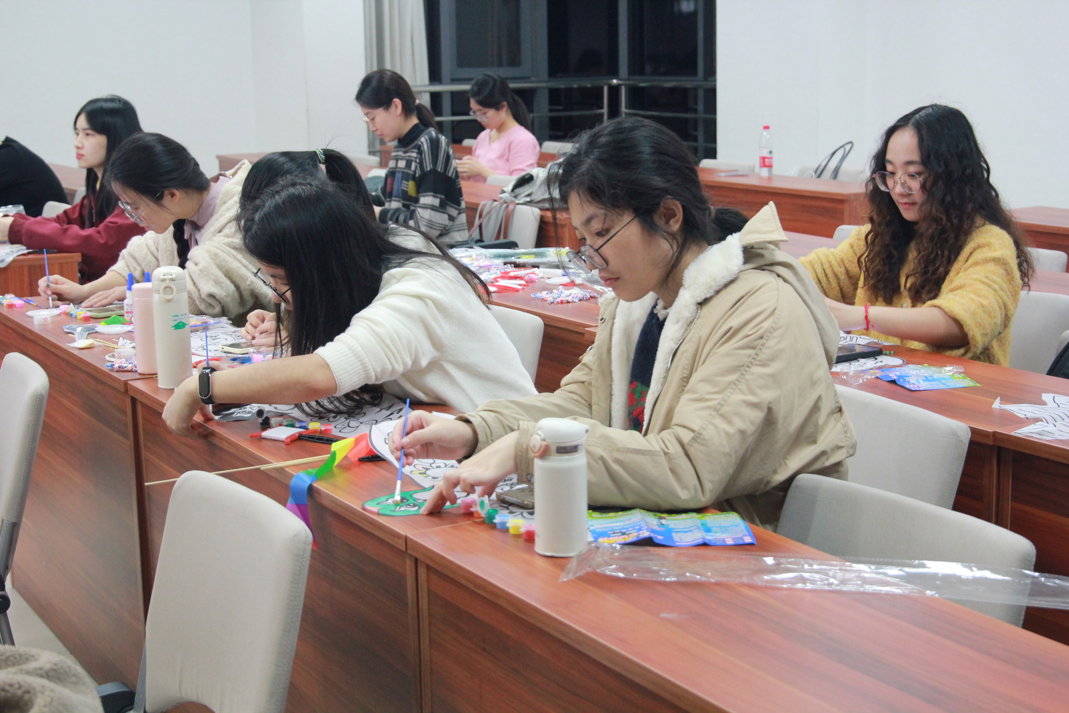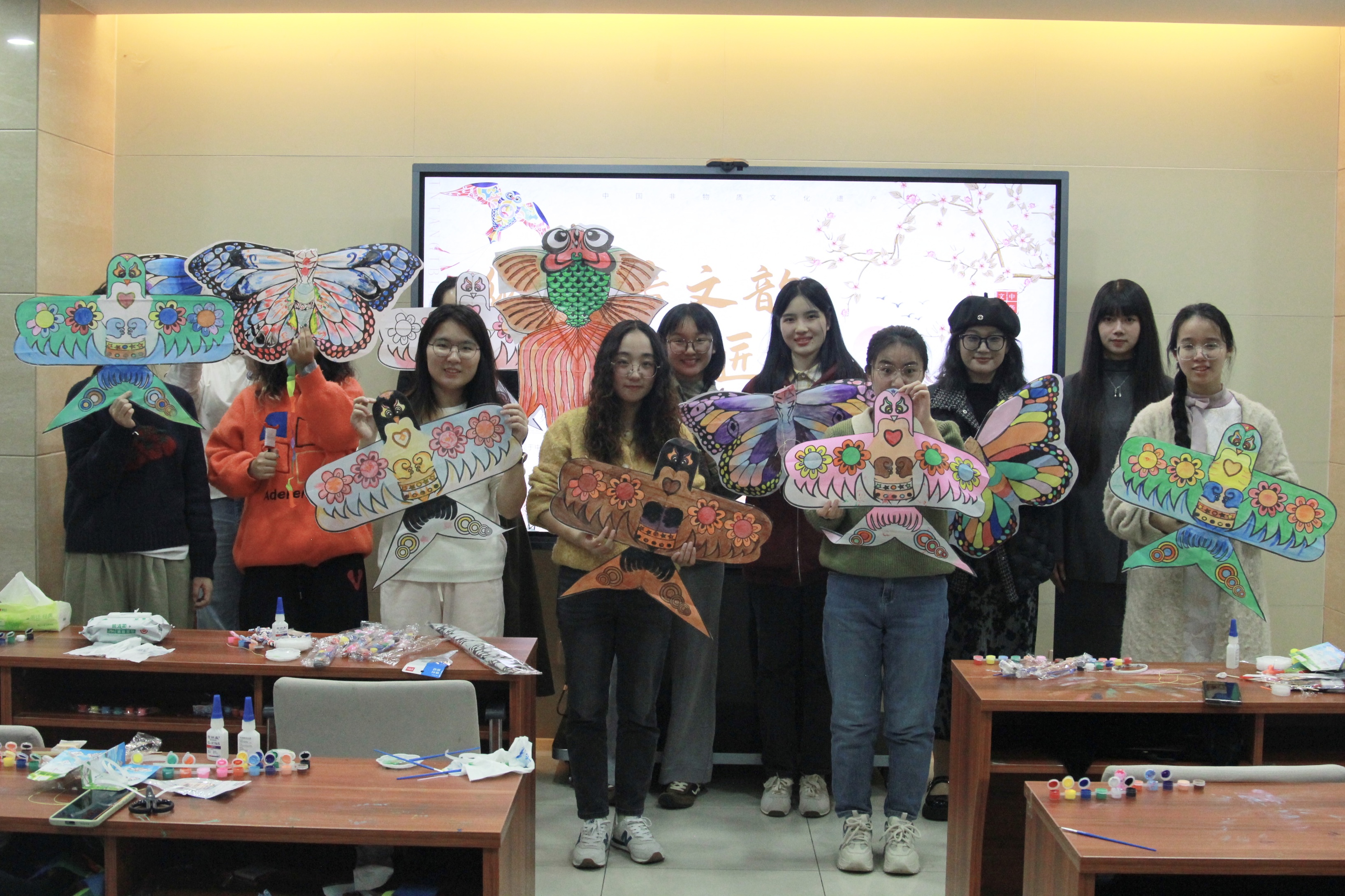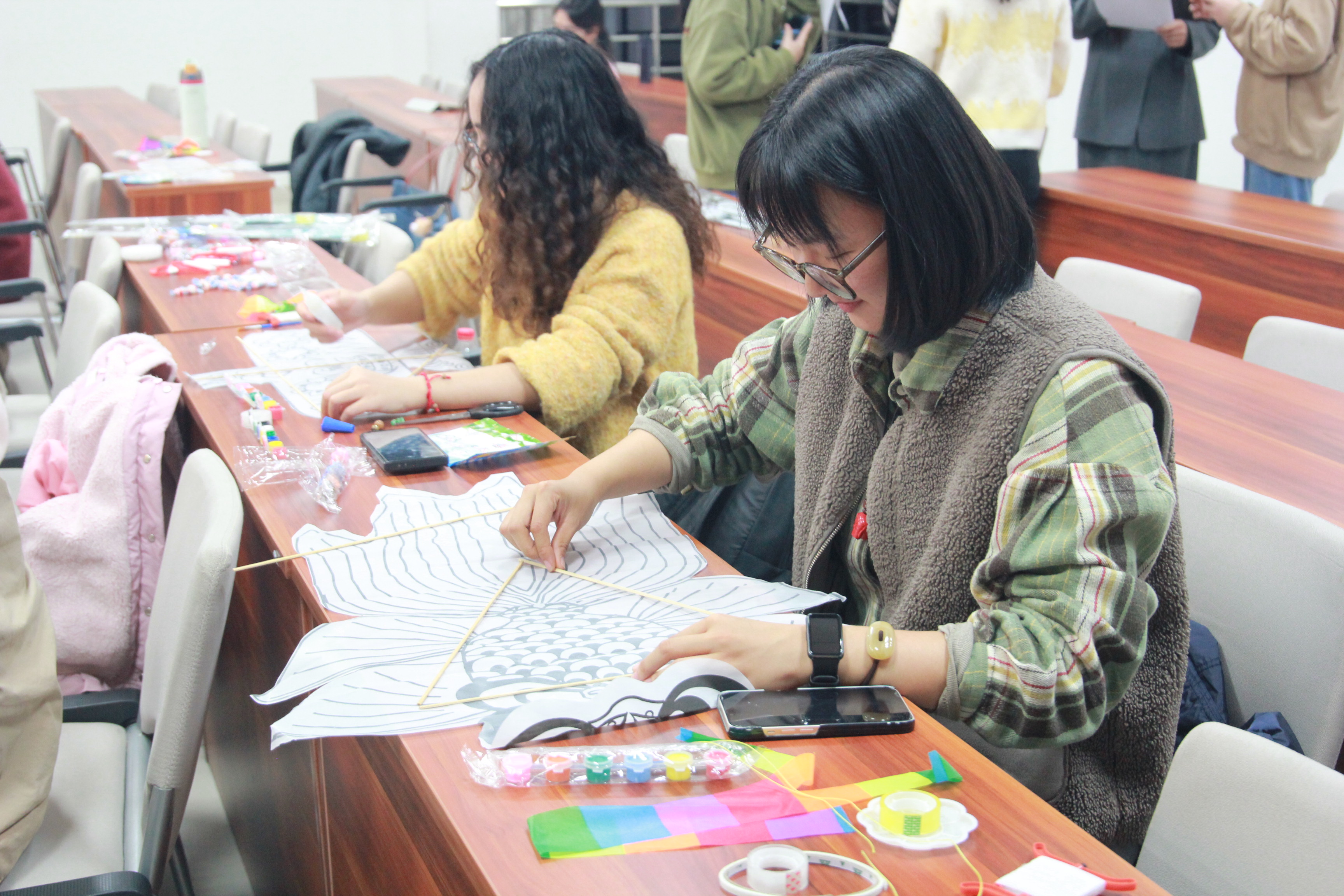 随后,活动进入风筝制作实践环节。在王君仪的专业指导下,同学们全身心投入到“扎骨架、糊纸、绘彩”的创作中,在竹篾与丝绢间穿梭,将对传统文化的理解与创意融入每一道工序:或以神话故事为灵感设计图案,或用吉祥寓意的纹饰点缀画面,原本零散的竹篾、纸张等材料逐渐变成了形态各异、创意十足的风筝雏形,指尖的劳作让非遗技艺变得可感可触。