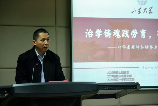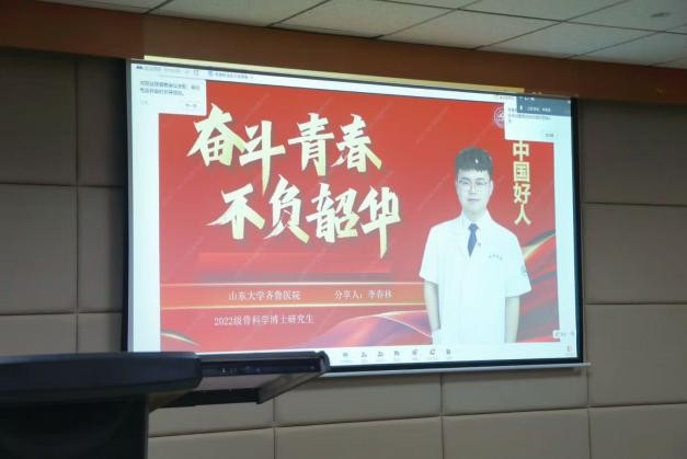 随后,活动进入榜样引领环节,“中国好人”称号获得者、齐鲁医院博士生李春林线上分享了他的实践经历。他结合一年内五次在公共场所成功救治病患、200场义诊、研发基层防治系统的实践经历,讲述了知识与劳动相结合的真切体会。他强调,“劳动不是学术的对立面,而是学术成长的土壤”,生动诠释了专业学习与社会担当的深度融合。最后他表达了对公司学子真正做到把论文写在祖国大地上的深情期许与“学在山大,快乐成长”的真挚祝福。