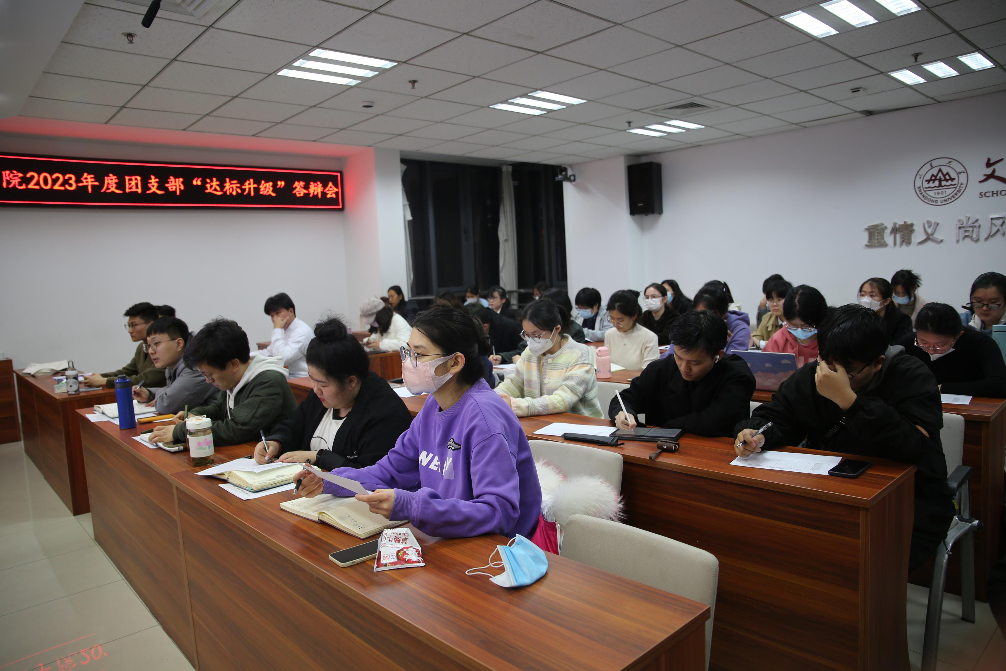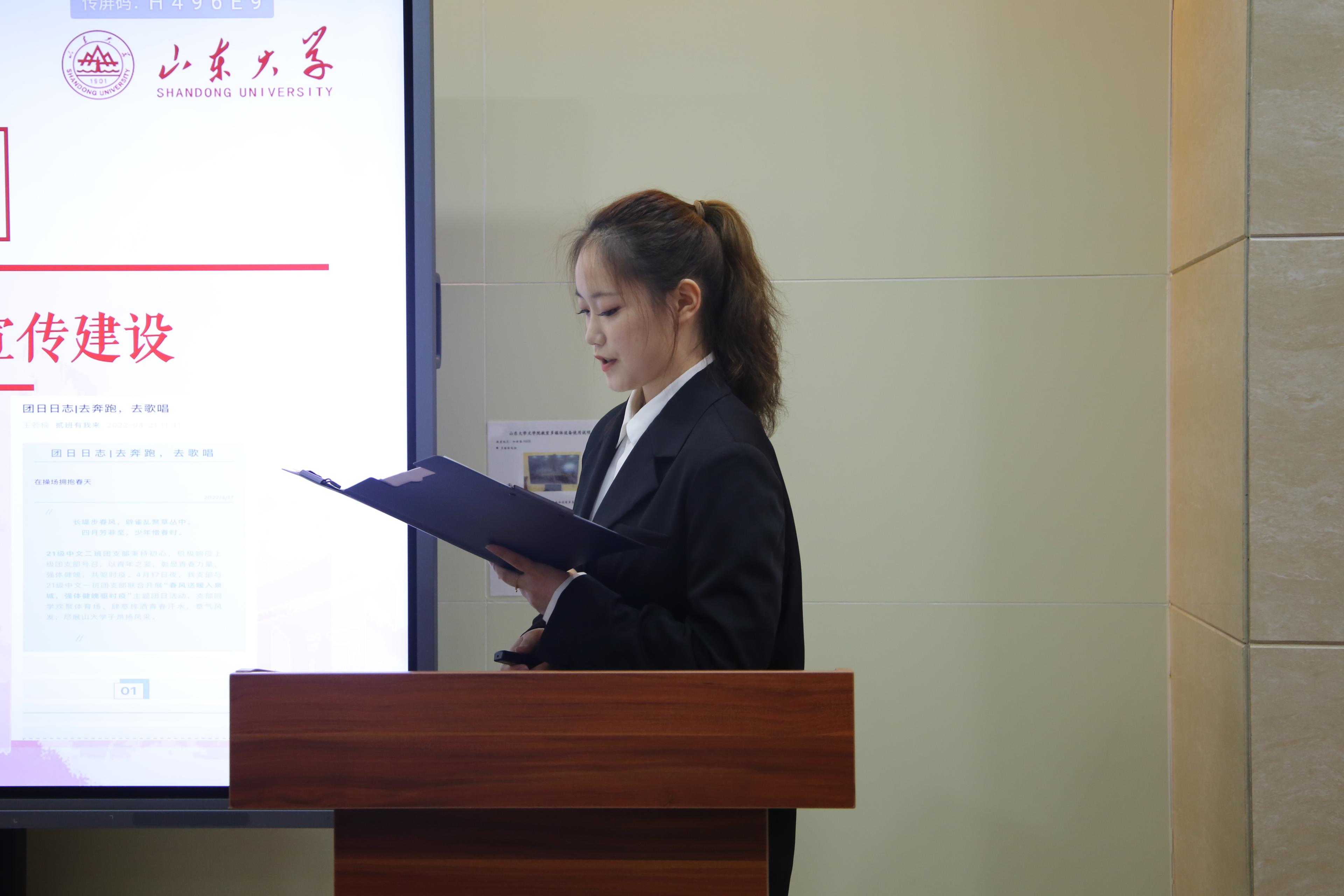 本次答辩按照抽签顺序进行。各团支部围绕组织建设、思想引领、活动组织等方面,多角度、全方位地介绍了本支部的发展现状和工作成果,在汇报总结的同时进行自我反思,并对团支部的未来发展作出展望与规划。在组织建设方面,各支部书记汇报了本支部的成员组成、组织生活、制度落实等内容。在思想引领上,各团支部大力开展党的二十大精神学习,积极组织收看党的二十大开幕会、庆祝中国共产主义青年团成立100周年大会等重要会议转播;通过参加青年大学习网上主题团课,学习党史和最新政策动向;通过举办各类线下实践活动、观影活动,促使团员青年将学习所得化为躬行实践。在活动举办方面,各团支部紧跟校、院团委号召,积极参与团支部“创新立项”,持续开展覆盖志愿服务、体育锻炼、学风建设等多种主题的团日活动,彰显学子担当、一展青春风采。