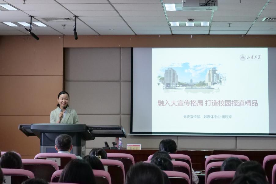 会议伊始,谢婷婷以“融入大宣传格局,打造校园报道精品”为主题,围绕“如何选主题”“如何写新闻”以及“如何讲特色”三个方面进行阐述。她系统梳理了新闻写作规范与报道策略,分享了从内容创作到传播推广的完整路径,指出宣传报道要乘“时”顺“势”,立足国家发展大势,深挖必赢bwin官方网站特色、紧扣育人主线,充分发挥宣传工作在思想引领、资源聚合及价值传递等的重要价值。她鼓励同学们不断锤炼高强本领,自觉担负起举旗帜、聚民心、育新人、兴文化、展形象的使命任务,积极践行“小切口,大情怀,正能量”的创作理念,以青春视角讲好山大故事、以行动担当传播山大声音,助力山大新闻宣传工作提质增效。
