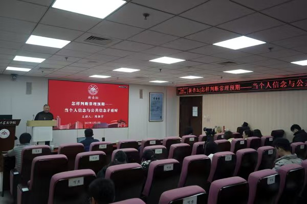 12月12日下午3时,复旦大学中国语言文学系陈振宇教授做客第423期“新杏坛”,于知新楼A620室作学术讲座,题为“怎样判断常理预期——当个人信念与公共信念矛盾时”。讲座由寇鑫教授主持,岳立静教授、黄维军副研究员出席,吸引了数十位员工前来聆听。